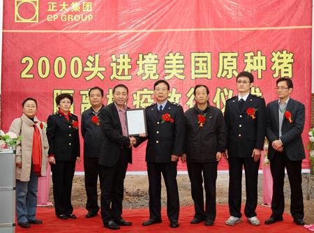 放行儀式上,陜西出入境檢驗檢疫局代表做了檢疫放行報告:“經(jīng)過3個多月的隔離檢驗,正大集團農(nóng)牧食品企業(yè)(中國區(qū))引進的2000頭原種豬完全符合安全檢疫標準,準予放行?!标兾鞒鋈刖硻z驗檢疫局代表為正大集團陜西區(qū)陳強總裁頒發(fā)了《種豬檢疫合格證書》。