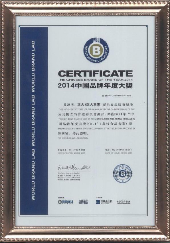 20141229日,總裁世界年會在北京東方君悅大酒店舉行。本次大會揭曉了享有中國品牌奧斯卡之稱的世界品牌實驗室2014年中國品牌年度大獎評選結(jié)果,正大集團(tuán)、中國國航、國家電網(wǎng)、騰訊控股、中國人壽、中國國旅、北汽集團(tuán)、華為技術(shù)、長虹電器等30個活躍在中國經(jīng)濟舞臺的領(lǐng)軍品牌榮獲中國品牌年度大獎,正大集團(tuán)以在農(nóng)牧食品業(yè)多年的探索實踐和管理經(jīng)驗,以及良好的產(chǎn)品品質(zhì)和品牌知名度,榮獲農(nóng)牧食品行業(yè)中國品牌年度大獎***”榮譽稱號。哈佛商學(xué)院教授約翰?戴騰博士(John Deighton)、耶魯大學(xué)管理學(xué)院教授萊維·多爾博士(Ravi Dhar)分別進(jìn)行頒獎及致詞。